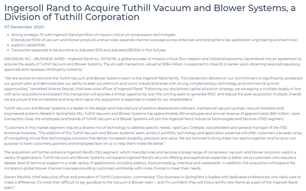 泰悉尔真空和鼓风机系统公司是设计和制造容积式鼓风机、机械真空泵、真空助力器和工程系统的领导者。泰悉尔真空和鼓风机系统公司总部位于密苏里州斯普林菲尔德,拥有约160名员工,年收入约6000万美元。交易完成后,泰悉尔真空和鼓风机业务的员工和品牌将加入英格索兰工业技术与服务(IT&S)部门。