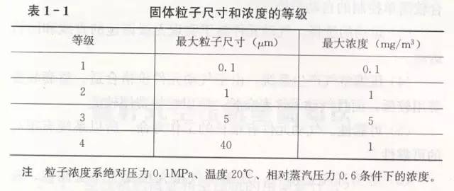 1)固体粒子。固体粒子尺寸和浓度的等级见表1-1。