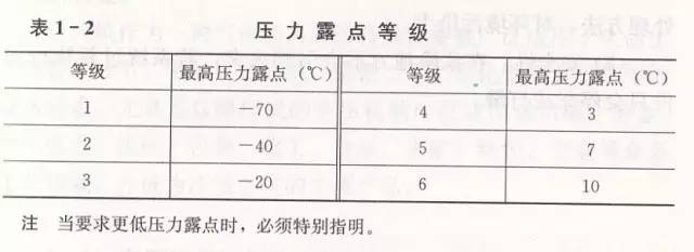 2)水。空气中水蒸气含量以压力露点表示,压力露点的等级见表1-2。