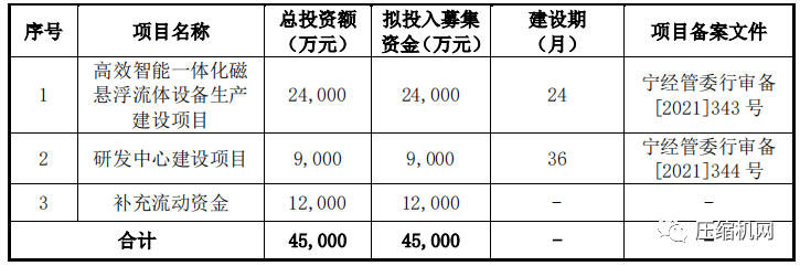 本次募资拟用于高效智能一体化磁悬浮流体设备生产建设项目、研发中心建设项目、补充流动资金。