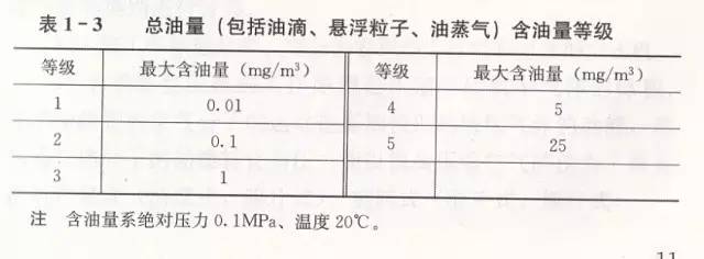 3)总油量(包括油滴、悬浮粒子、油蒸气)含油量等级见表1-3。